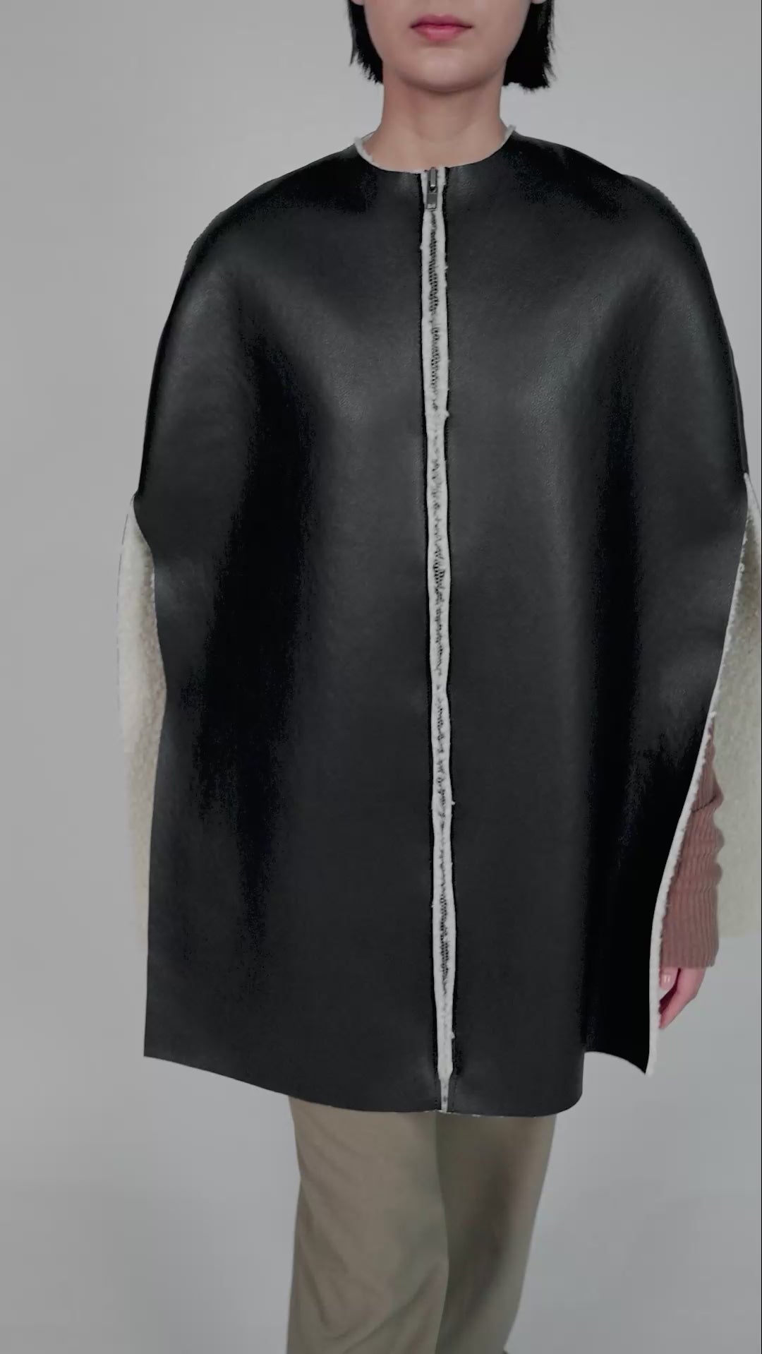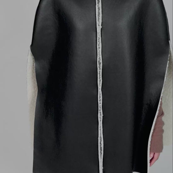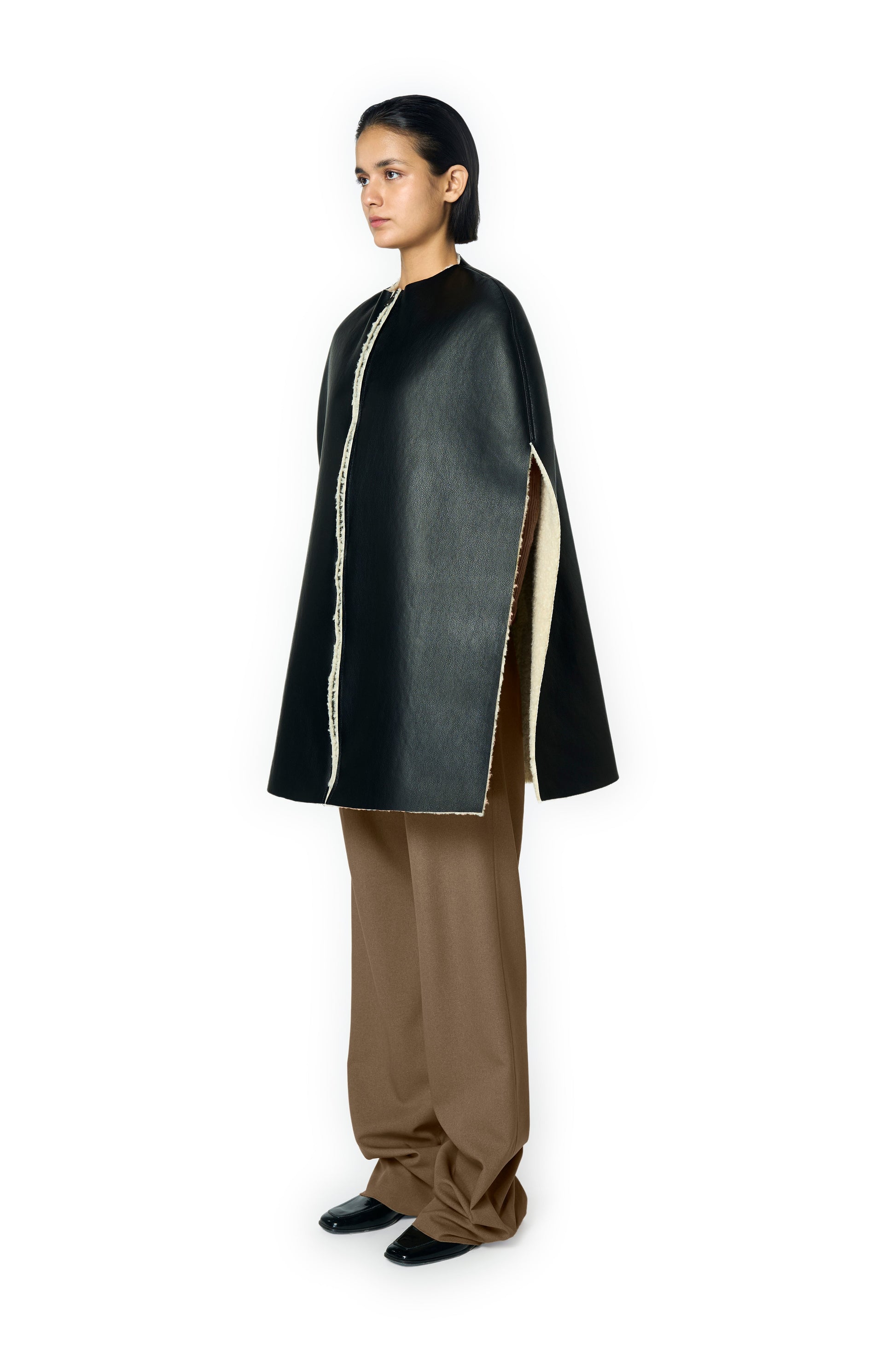 Cut from a soft vegan leather, with a shearling lining, this outerwear piece balances structure and softness, featuring clean lines, raw-edge detailing, and dramatic open sides for easy layering.