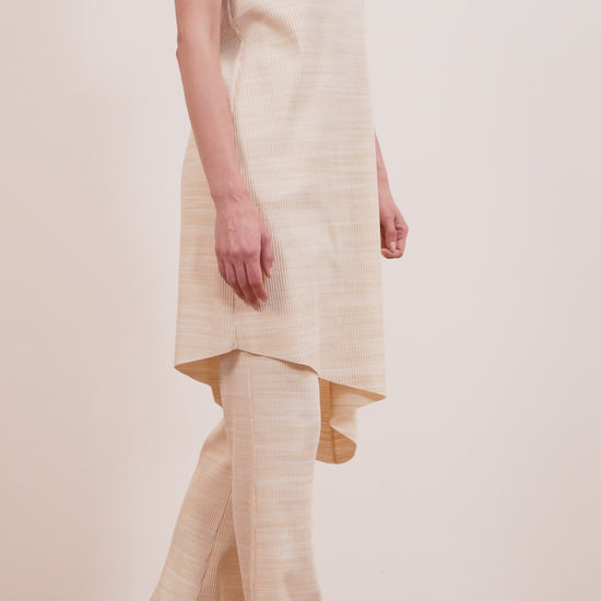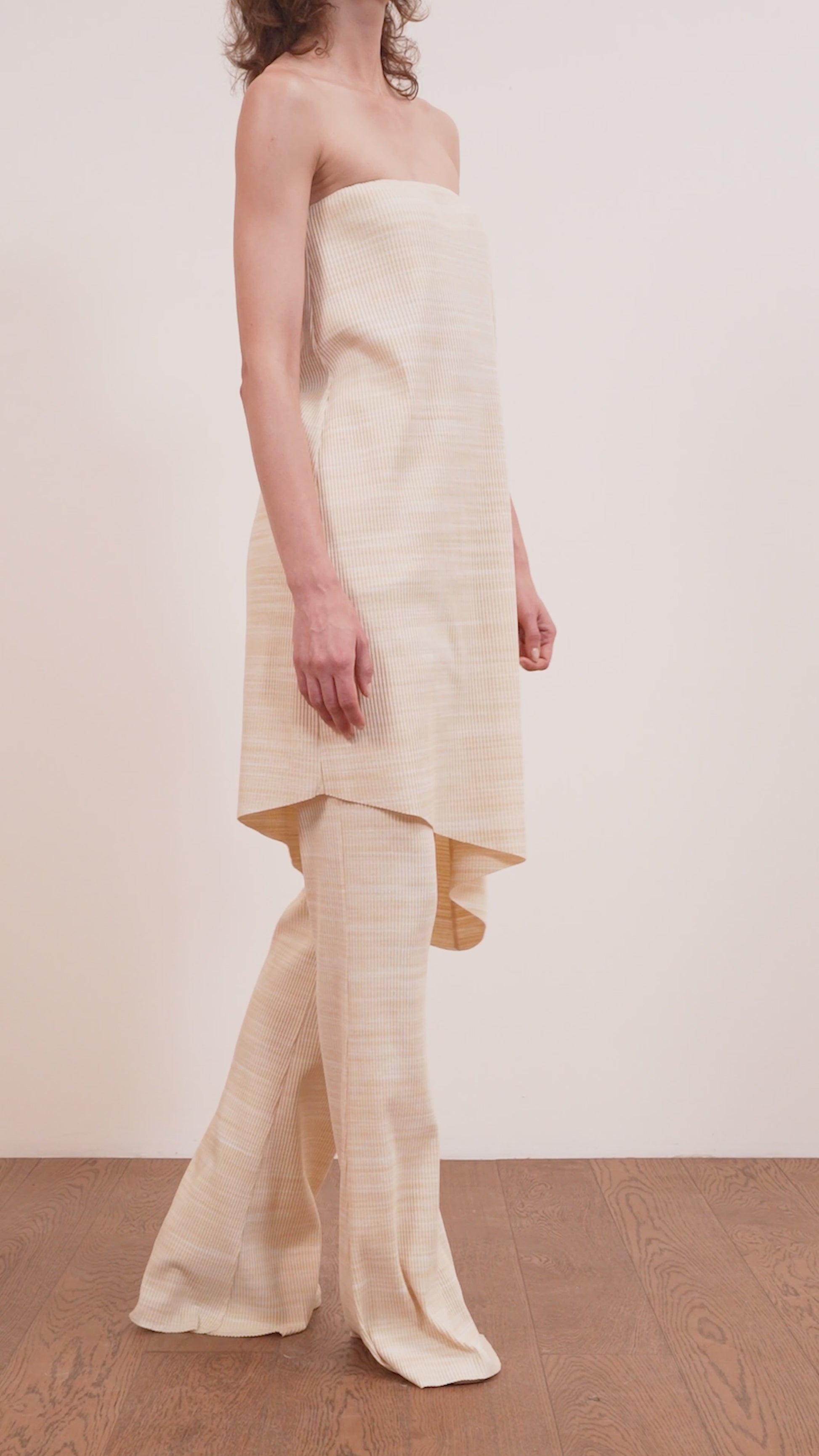 A fluid knit silhouette crafted in a soft melange rib. The Dries Top features a clean strapless neckline and an asymmetric drape that adds subtle movement and dimension. Designed to feel effortless yet refined, it pairs seamlessly with the coordinating Dries Trousers or stands alone as a statement.
