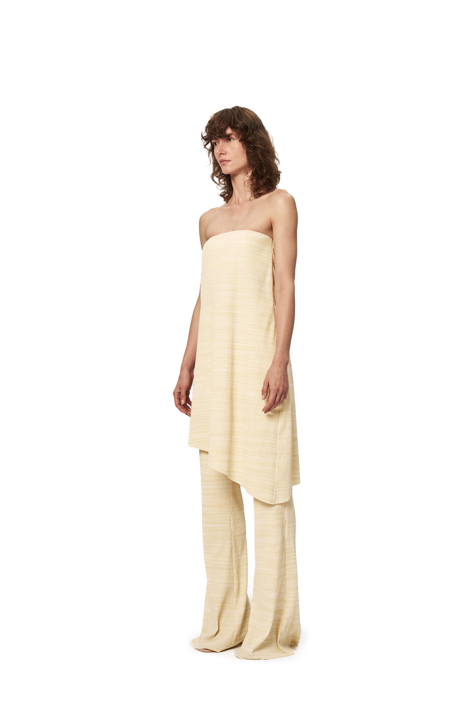 High-waisted, fitted trousers that open into a soft flared leg. The Dries Trousers feature a soft melange rib in a warm straw tone. Comfortable yet polished, they balance relaxed wearability with a clean, modern line. Pair with the Dries Top for a coordinated look.