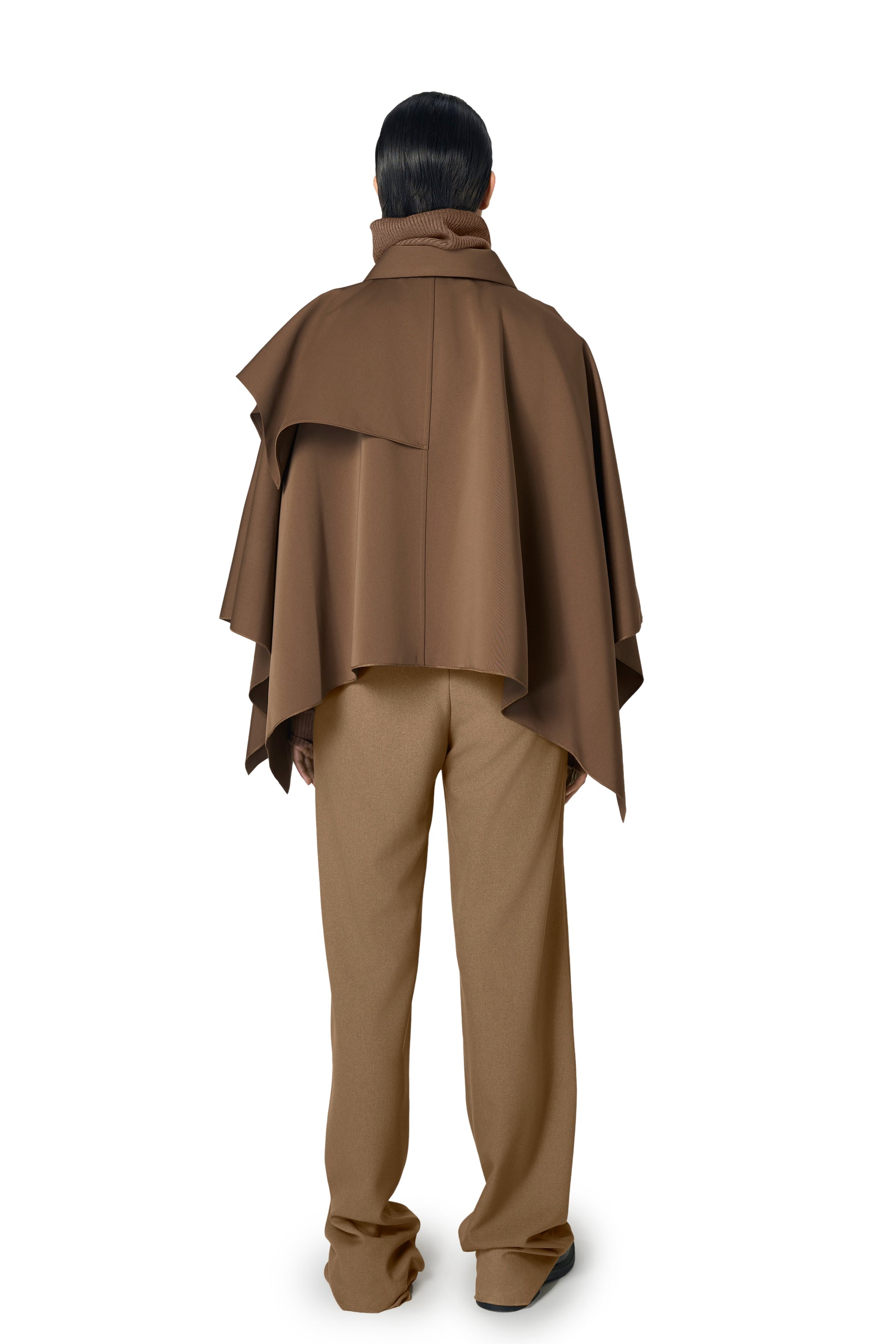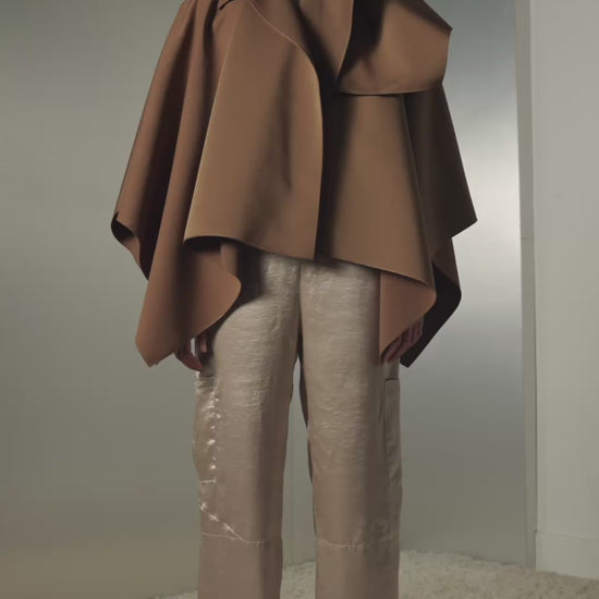 Crafted from a satiny finish, luxe fabric, the Ida Cape embodies Ura’s sculptural minimalism - a piece that feels both architectural and fluid. Cut in a rich chocolate tone, it drapes with sharp, asymmetric precision while retaining a sense of ease. The exaggerated lapel and layered panels create quiet drama, offering protection and elegance in equal measure.
