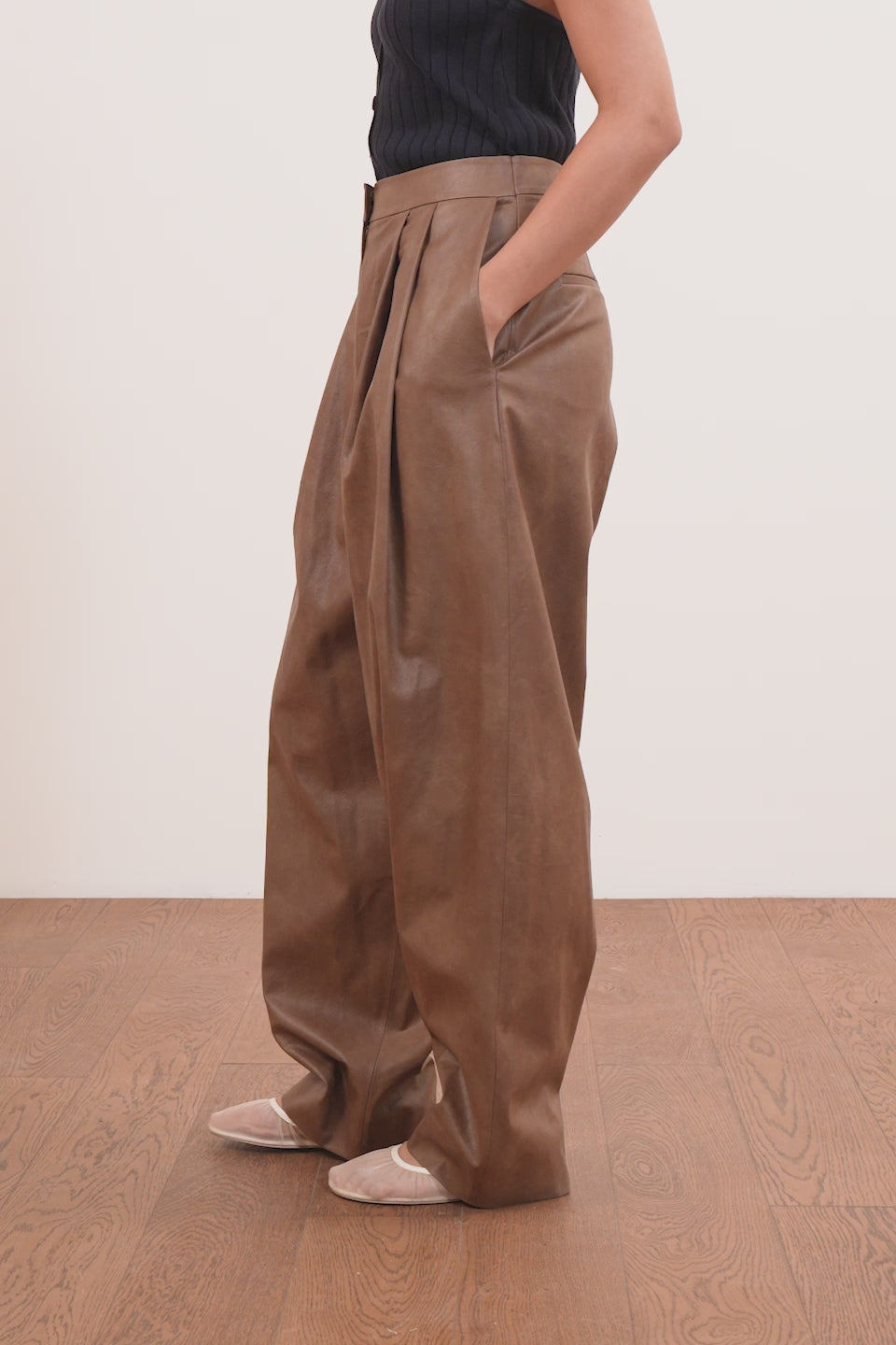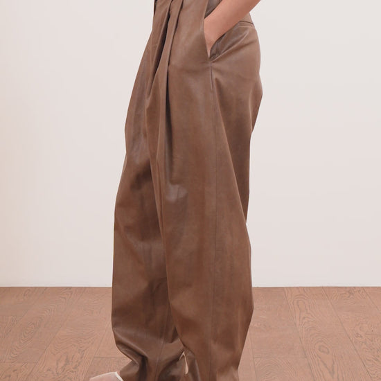 High-waisted trousers designed with soft structure and volume. The Odelia Trousers feature front pleats that create refined volume, falling into a relaxed silhouette. Crafted in smooth vegan leather, these trousers bring a refined edge to both day and evening styling.
