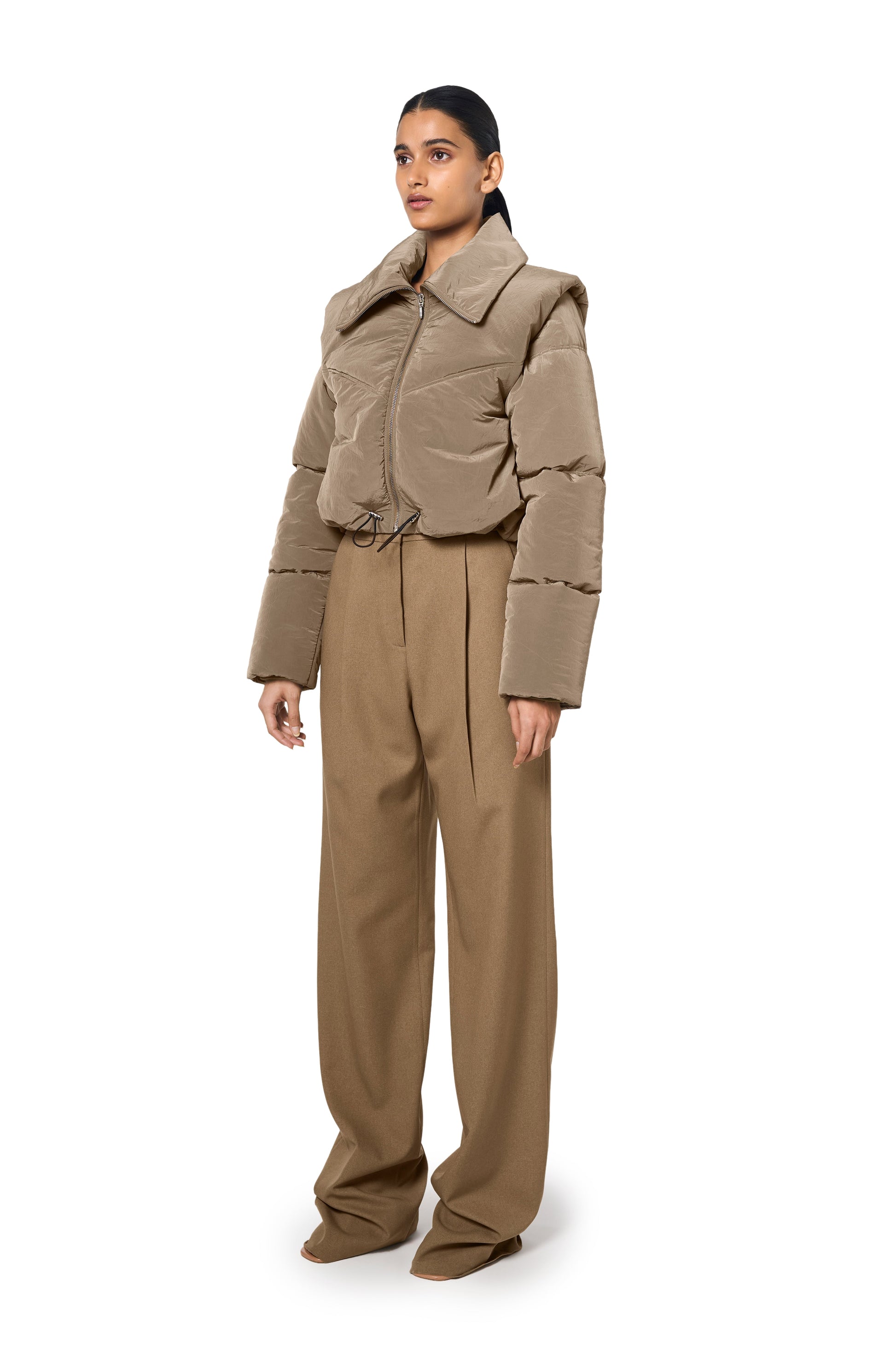 Ura's bestselling Pat Bomber is revisited in a luxe, technical fabric. The cropped length bomber jacket features a front metal zipper closure and a padded design for added warmth. Its wide collar enhances the stylish look, while the sage colour makes it a staple, easy to layer piece in your wardrobe. Comes with adjustable pullers at the hem.