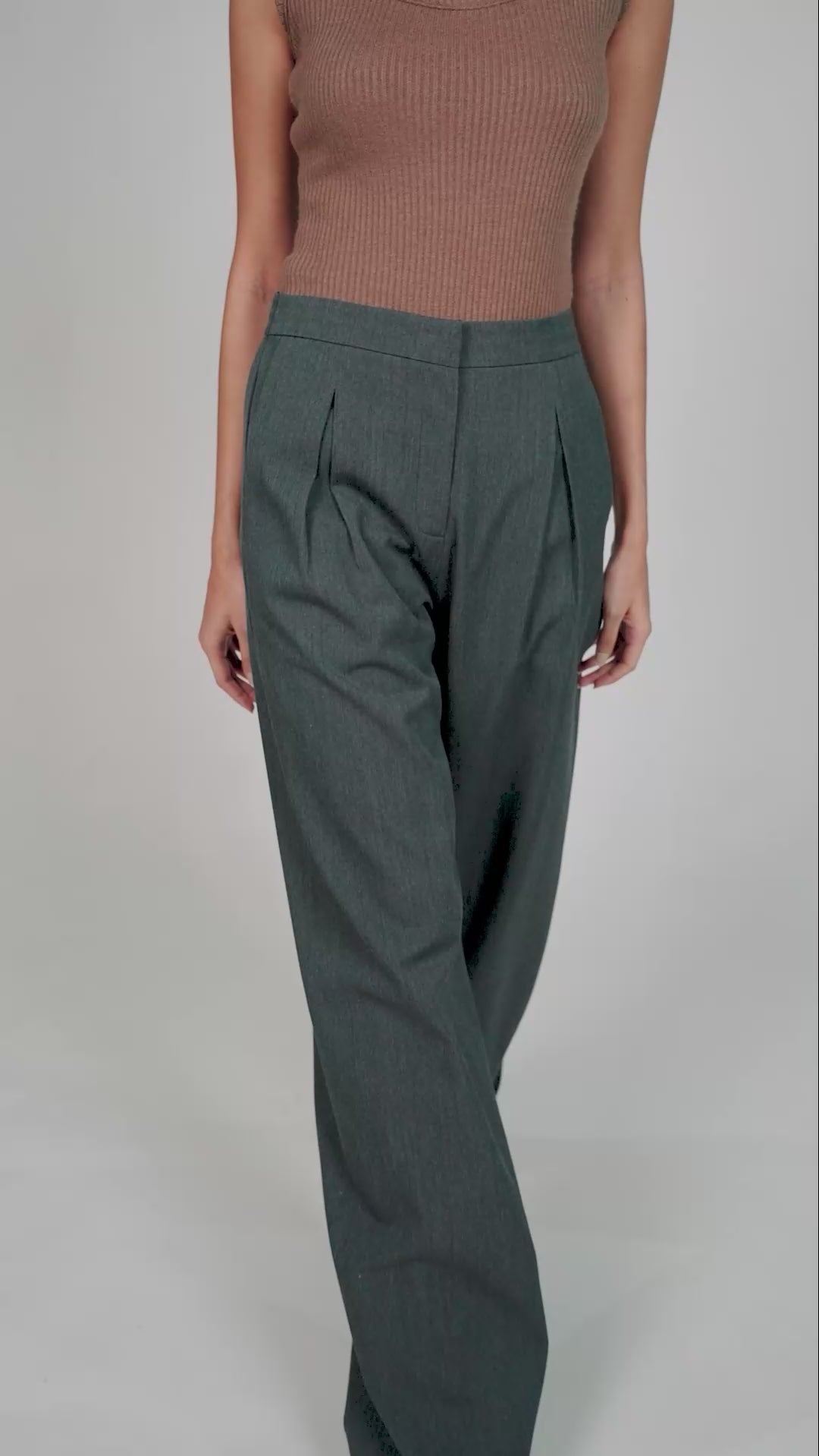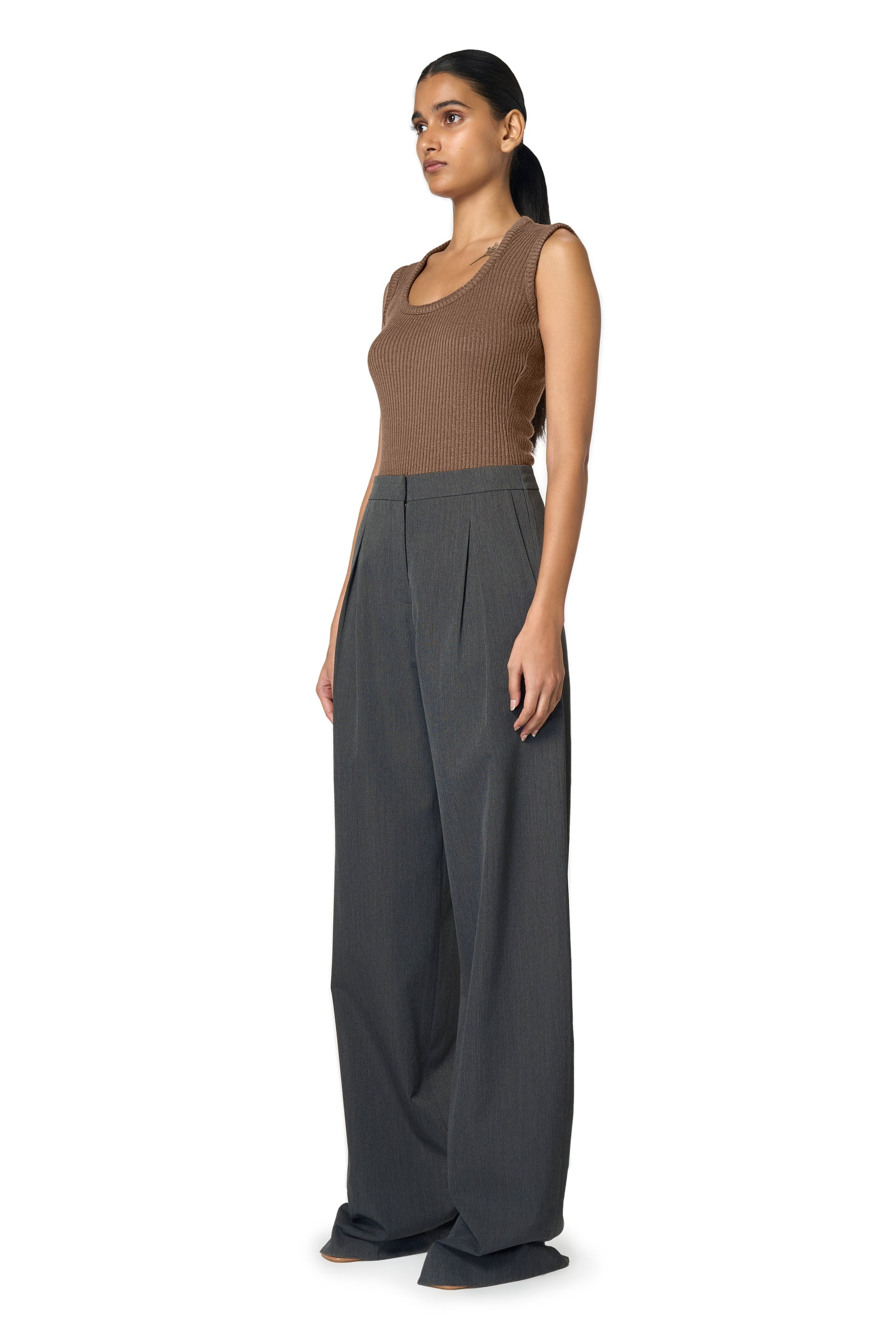 • High-waisted, wide-leg trousers.