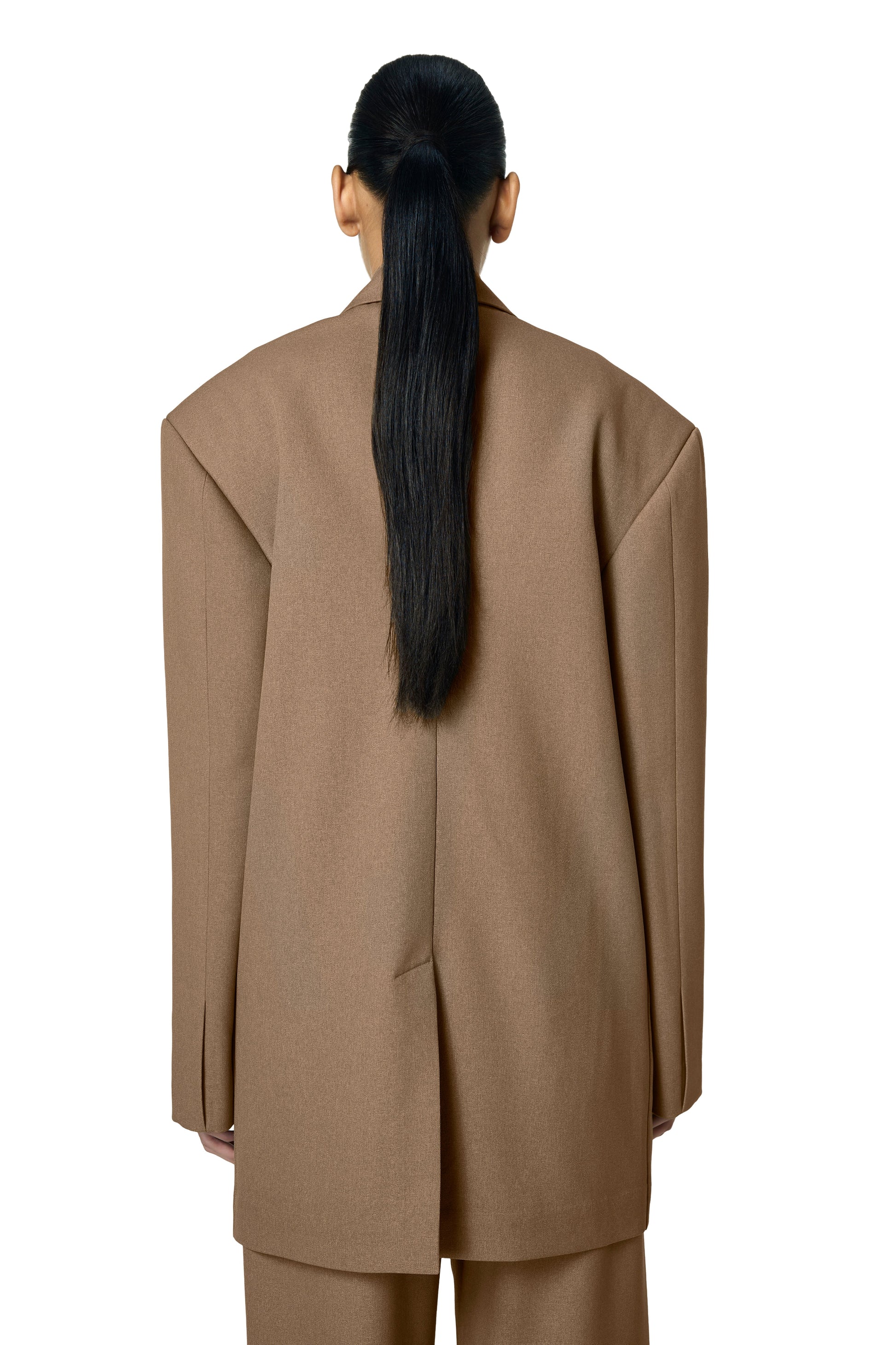 An oversized blazer in a warm camel color. Its most striking feature is the structural, broad shoulders, which give it a powerful look. The design includes two large flap pockets at the front, combining classic tailoring with a modern, dramatic fit. Pair it with the Toni Trousers for a complete look.